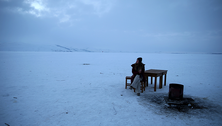Turistik trenin yolcuları, buzla kaplanan Çıldır Gölünü ziyaret ediyor.