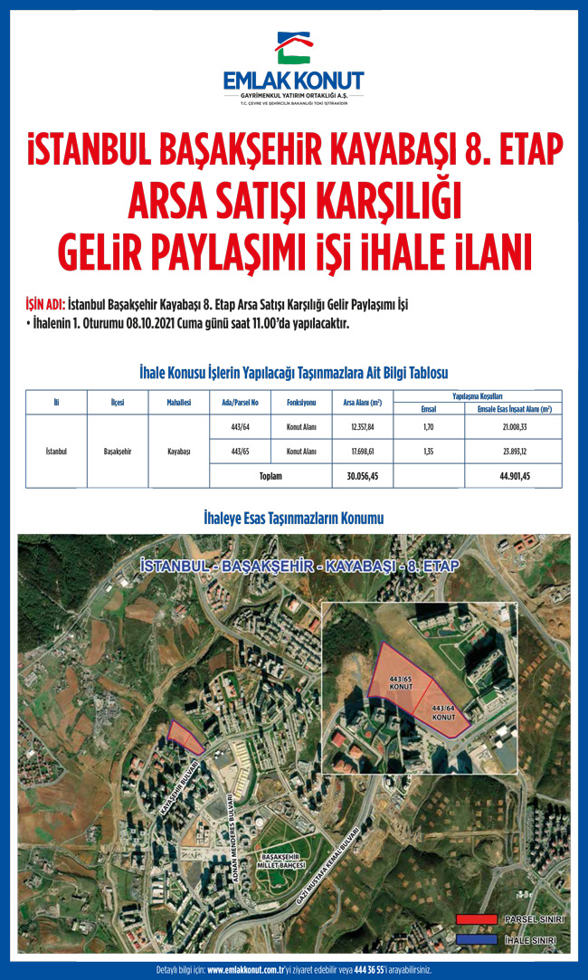 Gayrimenkul sektörünün lokomotifi Emlak Konut GYO, binlerce konut üretip milyarlarca lira yatırım yaptığı Başakşehir’de yeni bir ihale açıyor. Arsa satışı karşılığı gelir paylaşımı modeliyle satılacak Başakşehir Kayabaşı 8. Etap arsasında ihale 8 Ekim 2021 günü saat 11.00’de gerçekleştirilecek.