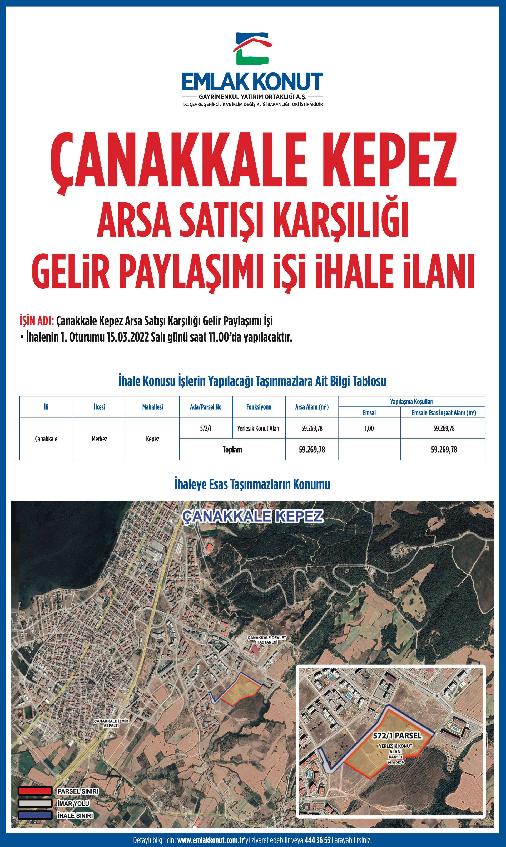 Emlak Konut GYO, Çanakkale Kepez bölgesi sınırlarında kalan 59 bin 269 metrekarelik arsayı ihaleye açıyor.