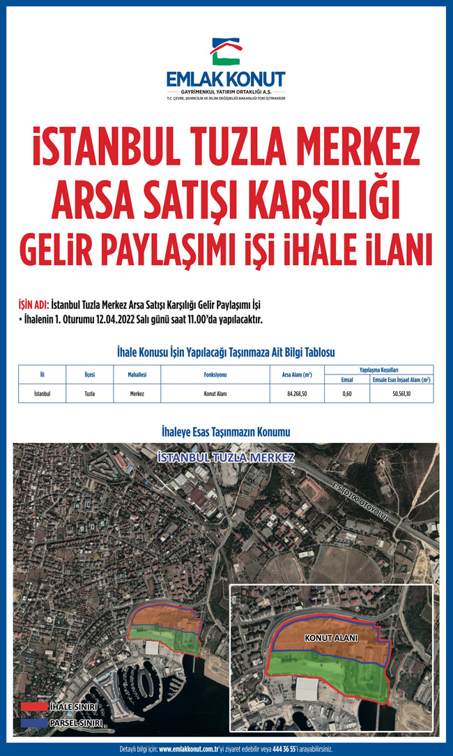 Emlak Konut GYO'nun Tuzla Merkez Mahallesi sınırlarında yer alan konut alanı imarına sahip arsası 84 bin 268 metrekare büyüklüğe sahip. Emsali 0,60 olarak belirlenen taşınmaz üzerinde 50 bin 561 metrekare inşaat yapma izni bulunuyor.