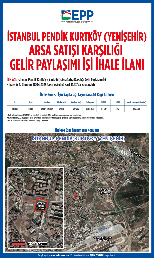 Emlak Planlama İnşaat Proje Yönetimi (EPP) Pendik-Kurtköy'de, Emlak Konut GYO ise Tuzla lokasyonunda yer alan taşınmazlarını, arsa satışı karşılığı gelir paylaşımı modeliyle ihaleye açtı.