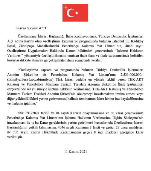 Özelleştirme İdaresi Başkanlığı tarafından ihaleye açılan Fenerbahçe Kalamış Yat Limanı Özelleştirme işini, 2 milyar 531 milyon TL bedelle Tek-Art kazandı. Marinanın 40 yıllık işletme hakkını kapsayan ihaleyle ilgili karar Resmi Gazete’de yayımlandı.
