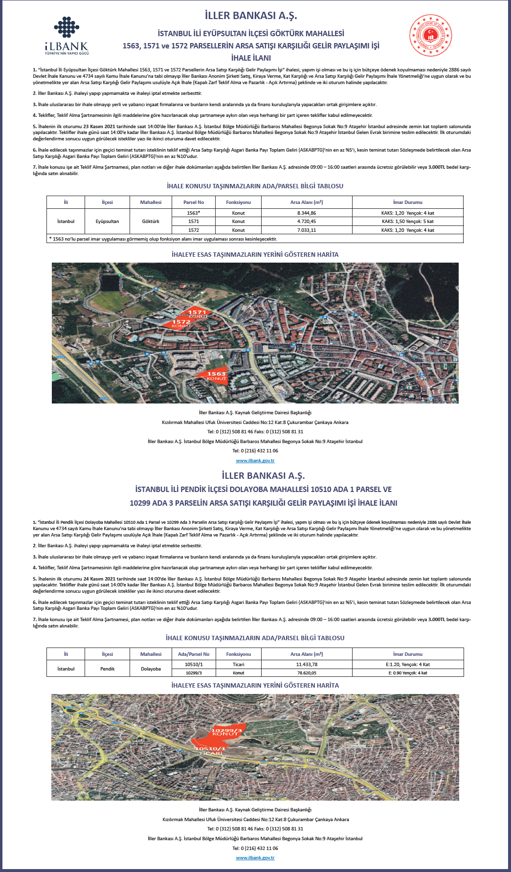 İller Bankası, Eyüpsultan Göktürk lokasyonu ve Pendik Dolayoba aksında toplam 5 parsel arsayı satışa açtı. Göktürk Mahallesi sınırlarında yer alan konut imarına sahip 3 parsel arsanın büyüklükleri 4 bin 720 metrekare, 7 bin 33 metrekare ve 8 bin 344 metrekare olarak farklılık gösteriyor. İmar planı kapsamında parsellerden ikisi üzerinde en fazla 4, bir tanesi üzerinde ise en fazla 5 katlı yapı inşa edilebilecek.