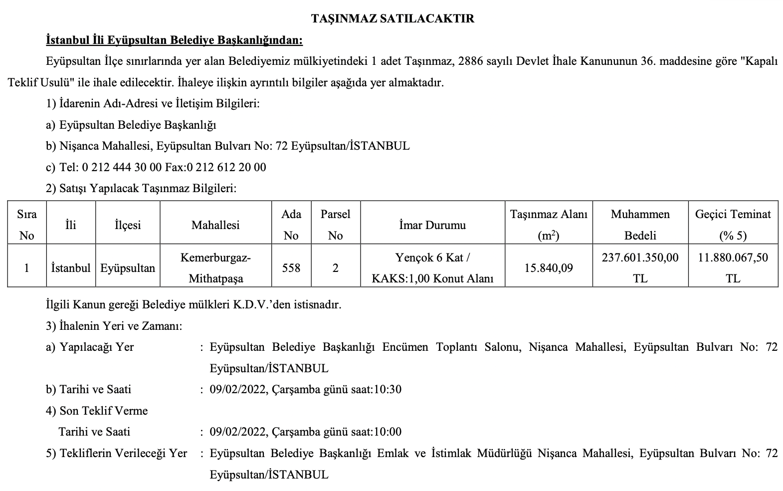 Kemerburgaz-Mithatpaşa aksında yer alan 15 bin 840 metrekarelik konut alanı imarına sahip arsanın tahmini bedeli 237 milyon 601 bin TL olarak açıklandı.