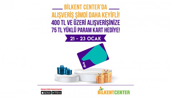 Bilkent Center, 21-23 Ocak tarihleri arasında en fazla iki fişte 400 TL ve üzeri alışveriş yapan ziyaretçilerine 75 TL değerinde anında harcamaya hazır Param Kart hediye ediyor.