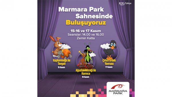 15-16 ve 17 Kasım günlerinde Marmara Park zemin kat etkinlik alanında gerçekleşecek çocuk tiyatrolarını tüm çocuklar ücretsiz olarak izleyebilecek. 15 Kasım Pazartesi günü Kaplumbağa ile Tavşan, 16 Kasım Salı günü Ağustos Böceği ile Karınca, 17 Kasım Çarşamba günü Çirkin Ördek Yavrusu adlı çocuk oyunları, 14.00 ve 16.00 saatlerinde iki seans şeklinde sergilenecek.
