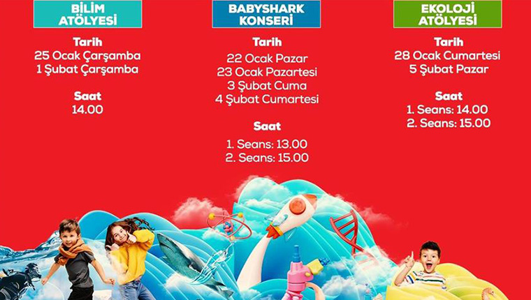 Yarıyıl tatiline girecek çocuklar, su altı dünyasını keşfederken, Baby Shark Müzikali, interaktif bilim atölyesi ve geri dönüşüm malzemelerinden teraryum tasarlayacakları ekoloji atölyesine katılabilecek.