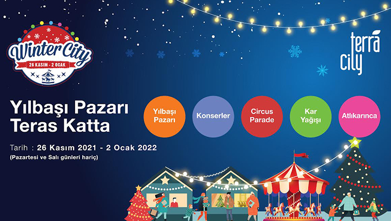 TerraCity’de 26 Kasım 2021-02 Ocak 2022 14.00-20.00 saatleri arasında (Pazartesi-Salı hariç) teras katta düzenlenecek olan WinterCity festivali, ziyaretçilerine atlıkarıncadan yılbaşı pazarına, canlı müzikten kar yağışına kadar yılbaşı ruhunu yansıtan her anı yaşatacak.