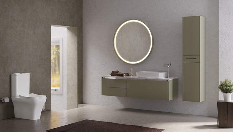 Premium kategorisinde tasarlanarak hayata geçen Flat, 160 cm’lik palazzo renk lake kaplama gövdesi ve suya dayanıklı geniş granit tezgâhı ile konforlu kullanım fırsatı oluşturuyor. Flat’in geniş tezgahına ise Creavit’in 0.5 cm’lik ince kenar tasarımına sahip Red Dot tasarım ödüllü Loop lavabosu eşlik ediyor. Model içerisinde yer alan LED aydınlatmaya da sahip 100 cm’lik yuvarlak aynası ile makyaj ve kişisel bakım için duyulan ihtiyaçların hepsini tek noktadan karşılıyor.