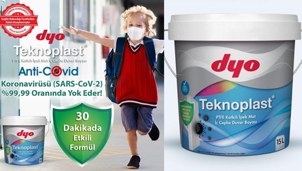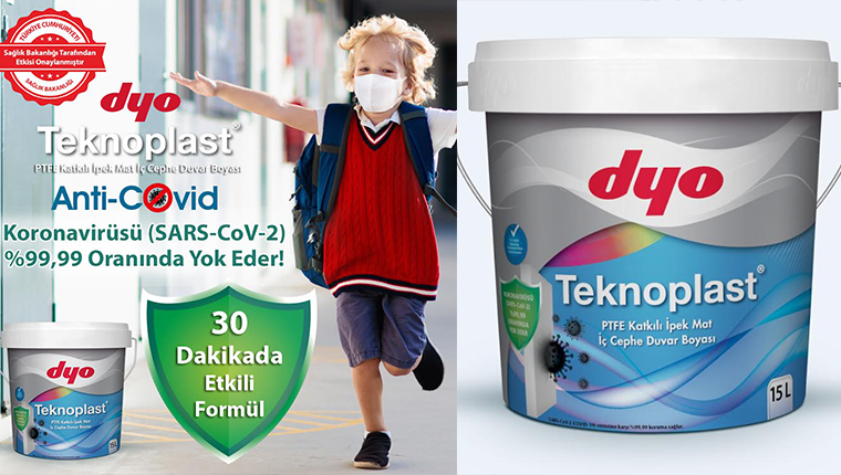 Kolayca silinebilen, mükemmel örtücülüğe sahip, ipek mat, son kat iç cephe boyası olan DYO Teknoplast, yeni formülü sayesinde, COVID-19 hastalığına neden olan SARS-CoV-2 virüsünün duvara temas ettiği ilk 30 dakika itibariyle %97,86 oranında etki gösterir ve 24 saat içerisinde % 99,99 oranında yok eder.