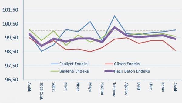 Rapora göre, Faaliyet Endeksi yaz aylarında görülen yükselişin ardından sonbaharda dengelendi ve Aralık ayında eşik değere oldukça yakın seviyede yatay seyrini sürdürdü. Güven Endeksi, yıl içindeki dalgalanmaların ardından Aralık ayında gerileyerek alt endeksler arasında en zayıf performansı sergiledi. Beklenti Endeksi ise yıl genelinde görece istikrarlı bir görünüm sergilemesine karşın Aralık ayında hafif düşüşle eşik değerin altında kaldı. Bu gelişmelere paralel olarak Hazır Beton Endeksi de yılın son ayında eşik değerin üzerine çıkamadı.