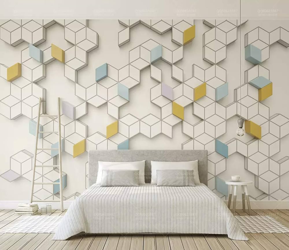 Duvarın bir tarafına geometrik şekiller çizerek alan belirginleştirilebilir. Aynı zamanda duvarda kullanılacak olan farklı renk boyalı tarafa, raflar ekleyerek ve raflara da dekoratif objeler yerleştirerek sade ve şık bir yatak odası dekorasyonu da tasarlanabilir.
