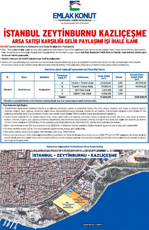 Dini tesis alanı 2 bin 612 metrekare, eğitim tesis alanı ise 4 bin 96 metrekare olarak belirlenen Zeytinburnu Kazlıçeşme arsa ihalesinde ilk oturum 24 Aralık 2013 günü saat 14.30'da Emlak Konut GYO Ataşehir binasında yapılacak.