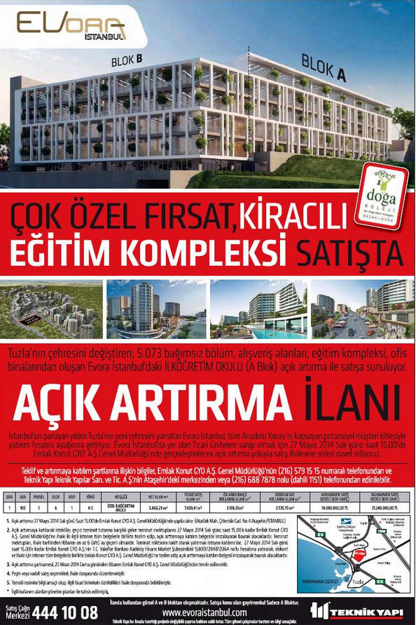 Emlak Konut GYO, Evora İstanbul projesinin A bloğunda yer alan eğitim kompleksini satışa çıkardı. Doğa Koleji'nin kiracı olduğu ilköğretim okulu 6 bin 866 metrekare net alana sahip. KDV hariç tahmini bedeli 18 milyon lira, KDV dahil tahmini bedeli 21 milyon 240 bin lira olarak belirlenen okulun ve diğer gayrimenkullerin ihalesi 27 Mayıs 2014 günü saat 15.00'te Emlak Konut GYO Ataşehir binasında gerçekleştirilecek.