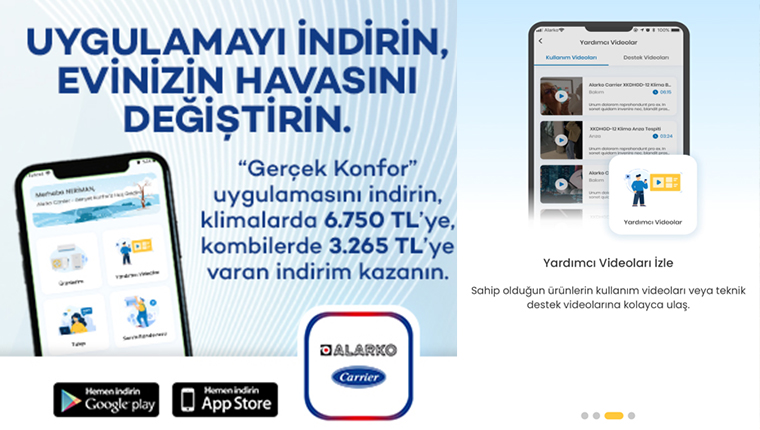 Alarko Carrier’ın yeni mobil uygulamasıyla klima, kombi, ısı pompası ve satın alınan pek çok çeşit iklimlendirme ürünü ile ilgili satış sonrası ihtiyaç duyulan bilgilere kolayca erişilebiliyor. Ayrıca 1 Mart-30 Nisan 2022 tarihleri Alarko Carrier, “Gerçek Konfor” uygulamasını indirip kayıt olan kullanıcılara Alarko markalı kombilerde 3.265 TL’ye, Alarko, Toshiba, Carrier markalı klimalarda ise 6.750 TL’ye varan indirim fırsatı sunuluyor.