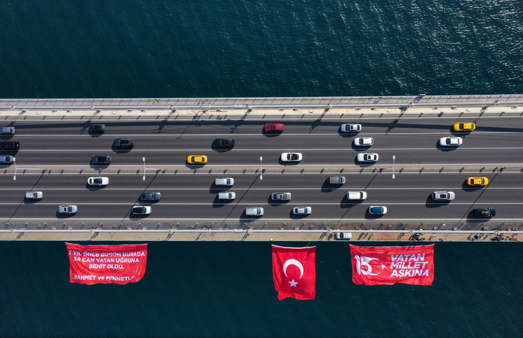 FETÖ'nün 15 Temmuz 2016'daki darbe girişiminin 7'nci yılında Cumhurbaşkanlığı İletişim Başkanlığı, İstanbul Valiliği ve 15 Temmuz Derneği işbirliğinde 15 Temmuz Şehitler Köprüsü'ne Türk bayrağı asıldı.