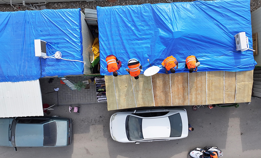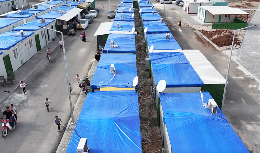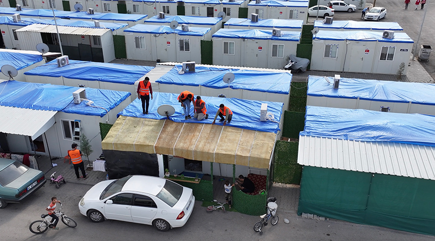 Kentteki barınma ünitelerinin üstüne yağışlardan etkilenmemesi için branda çekiliyor. Konteyner kentlerdeki çalışmalar Toplum Yararına Programlar (TYP) kapsamında görev yapan işçilerin desteğiyle sürüyor.
