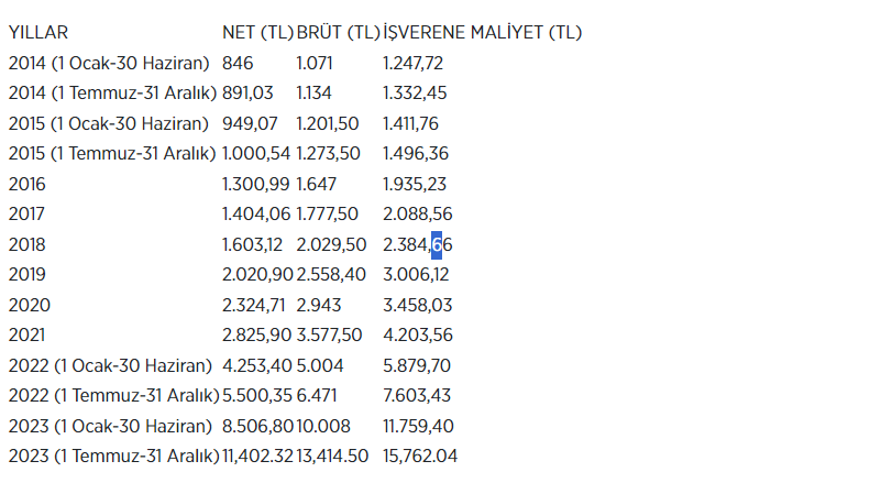 Asgari ücretin işverene toplam maliyeti, bir işçi için 15 bin 762 lira 4 kuruş. Bunun 13 bin 414 lira 50 kuruşu brüt asgari ücret, 2 bin 79 lira 25 kuruşunu sosyal güvenlik primi, 268 lira 29 kuruşunu işveren işsizlik sigorta primi oluşturuyor.