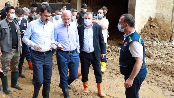 İçişleri Bakanı Süleyman Soylu, Çevre ve Şehircilik Bakanı Murat Kurum, Ulaştırma ve Altyapı Bakanı Adil Karaismailoğlu ile AK Parti Genel Başkan Yardımcısı Hayati Yazıcı, sel ve heyelan yaşanan Güneysu ilçe merkezinde incelemelerde bulundu.