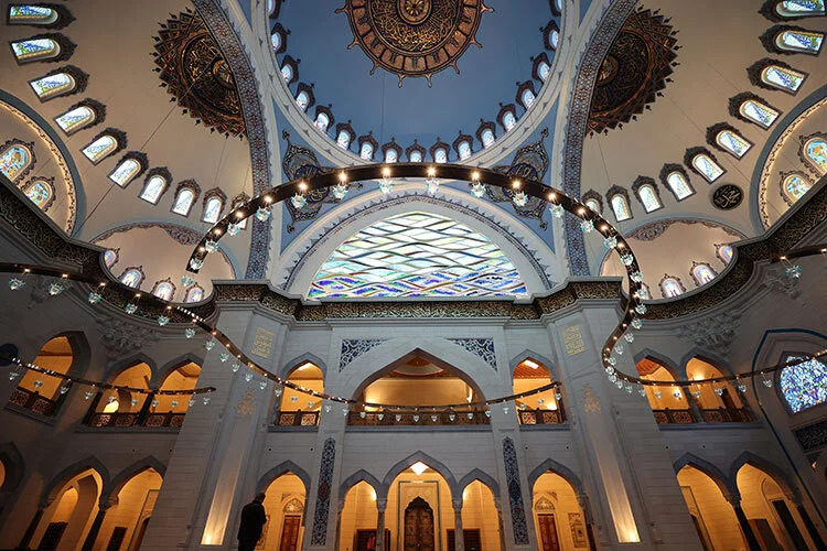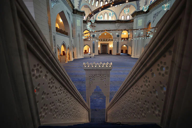 "Ana kubbe yazımızı, bir gemi dümeninin içerisine yazdık nano teknolojiyle. Tam göbeğinde 16 köşeli kutup yıldızı var. Camimizin ana kuşak yazısına, Rahman Suresi'nin tamamını yazdık. Fakat Nuruosmaniye Camii'den sonra yapılan en önemli örneklerden birisi yazımız konkav. Yani eğik bir yazı. Çok zor bir çalışmayla meydana gelen bir yazı olduğunu söyleyebilirim. Bir başka özellik mihrabımız. 700 sene sonra yani 1300'lü yıllarda yapılan bir örnekten yola çıkarak bugüne geldik. 80 bin parça çininin, yaklaşık 1,5 sene süren projelendirme, tasarım, imalat ve uygulamadan sonra meydana gelen bir projedir. "