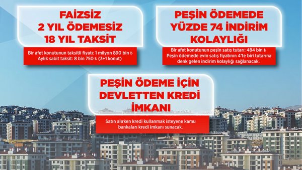 Konutlar, faizsiz, 18 yıl taksit imkanı ile sunulacak. Bu kapsamda, 3+1 olarak tasarlanan bir afet konutunun taksitli satış fiyatı 1 milyon 890 bin lira olacak, aylık sabit taksit tutarı ise 8 bin 750 lira olarak uygulanacak.