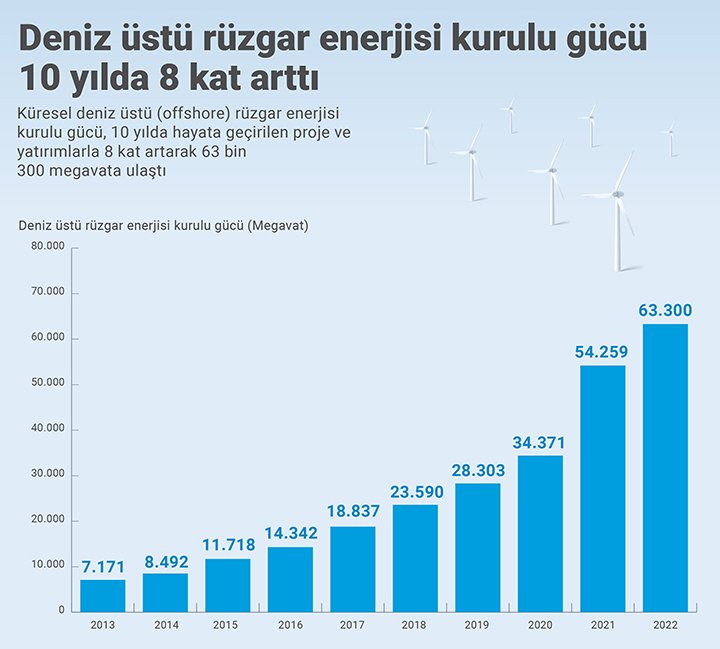 Deniz üstü rüzgar enerjisi kurulu gücü, 2022 sonu itibarıyla 2013'teki 7 bin 171 megavat seviyesine göre 8 kat artarak 63 bin 300 megavata ulaştı.