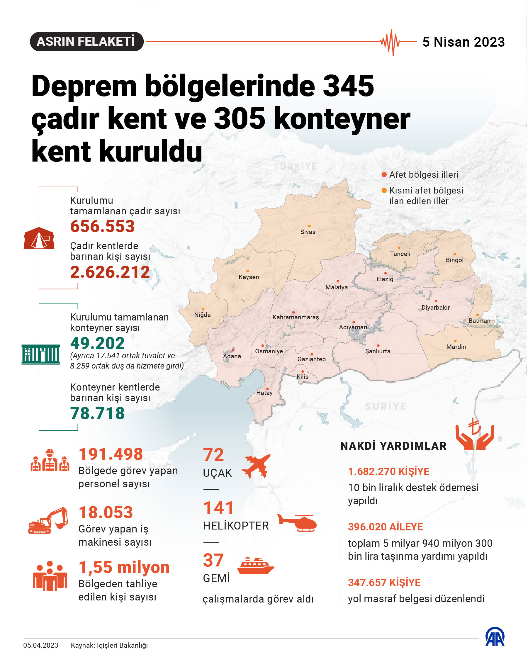 İçişleri Bakanlığı, Kahramanmaraş merkezli 6 Şubat'ta meydana gelen depremlerden etkilenen bölgelerde, 345 çadır kent ve 305 konteyner kentin kurulduğunu, bu alanlarda toplam barınan depremzede sayısının 2 milyon 796 bin 589 olduğunu bildirdi.