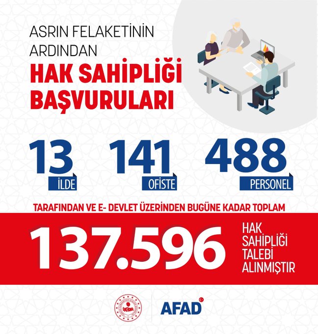 AFAD'ın sosyal medya hesabından yapılan paylaşımda, hak sahipliği için talep başvurularının, e-Devlet ve deprem bölgesinde kurulan ofislerde gerçekleştirilebildiği anımsatıldı.