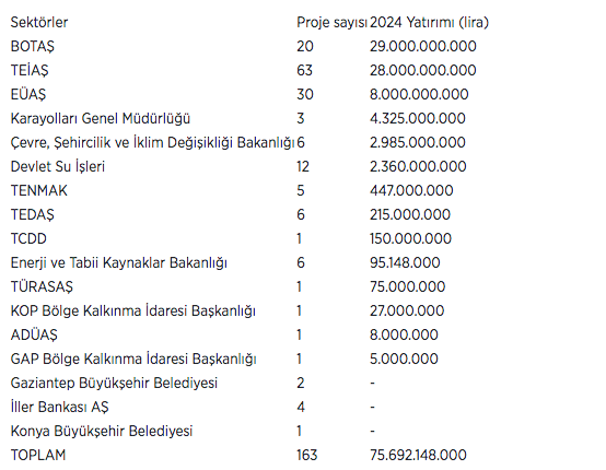 Bu yıl enerji sektöründe 163 proje için kaynak ayrıldı. Sektörde planlanan yatırımların kuruluşlara göre dağılımına bakıldığında 63 projeyle TEİAŞ başı çekerken, bu kurumu 30 projeyle EÜAŞ ve 20 projeyle BOTAŞ izledi.