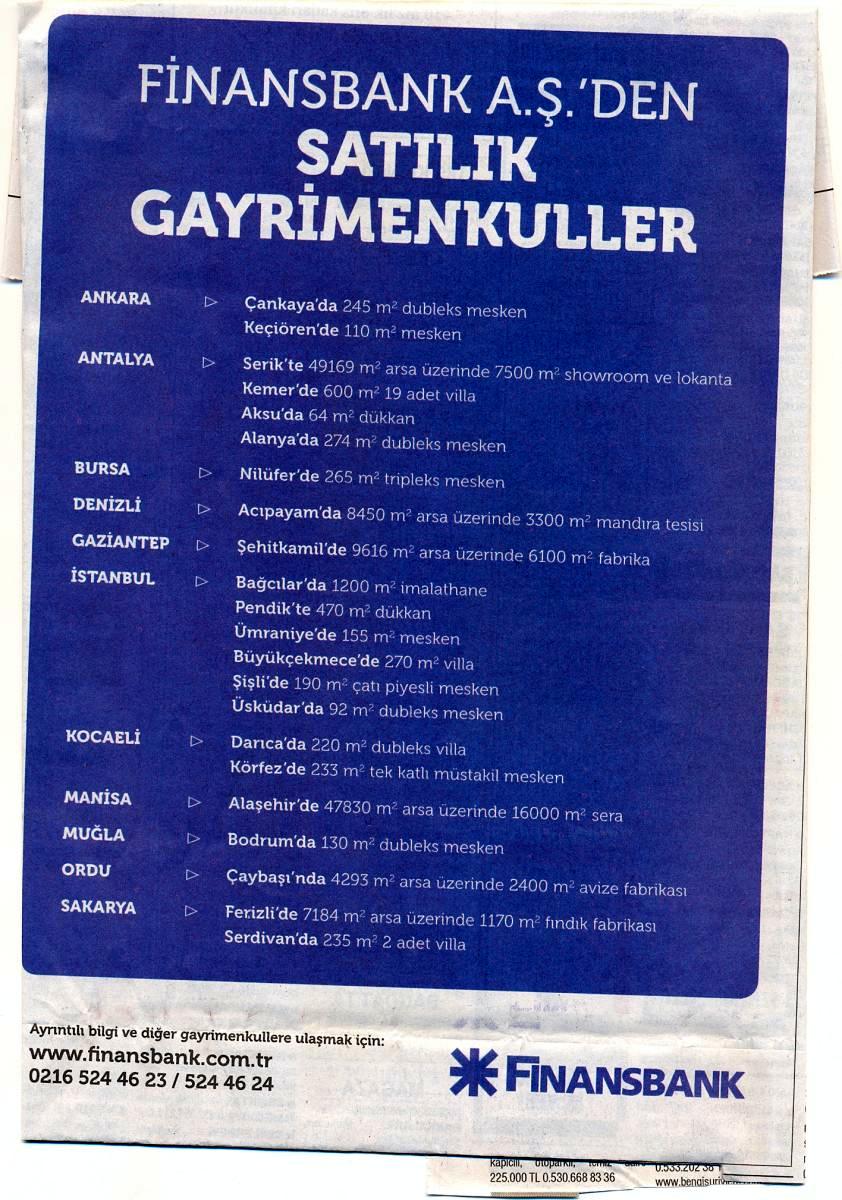 Finansbank'ın satışa çıkardığı gayrimenkullerle ilgili ayrıntılı bilgiye, www.finansbank.com.tr veya 0216 524 46 23 numaralı telefondan ulaşabilirsiniz.
