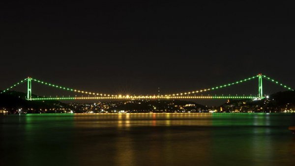 Fatih Sultan Mehmet (FSM) Köprüsü, Brezilya'nın bağımsızlığının 200. yılı dolayısıyla bu ülkenin bayrağının renkleriyle ışıklandırıldı.