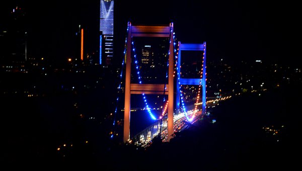 Önemli günlerde renk ve ışık gösterileriyle aydınlatılan Fatih Sultan Mehmet (FSM) Köprüsü bu kez Omurilik Felçlileri Günü'ne dikkati çekmek amacıyla mavi ve turuncu renkle aydınlatıldı.