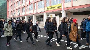 Gaziantep Lisesi'nde öğrenciler, saygı duruşu ve İstiklal Marşı'nın okunmasının ardından sınıflara alındı.