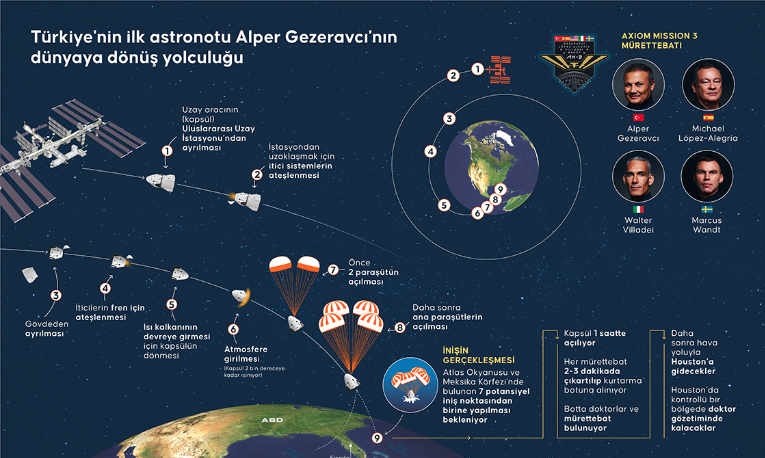 Türkiye'nin ilk astronotu Alper Gezeravcı'nın da içinde bulunduğu Axiom-3 (Ax-3) ekibini taşıyan Dragon kapsülünün, 9 Şubat'ta ABD yerel saatiyle 08.30'dan sonra (TSİ 16.30) Florida'da Daytona Beach bölgesinde okyanusa iniş yapması bekleniyor.