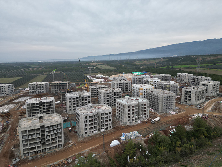 Hatay'ın Dörtyol ilçesinde, 6 Şubat depremlerinin ardından yapımına başlanan afet konutlarının inşası sürüyor.