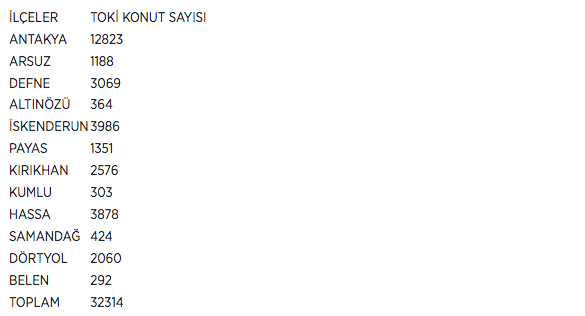 Hatay'ın ilçelerine göre yapımı süren TOKİ'nin kalıcı konut sayıları şöyle: