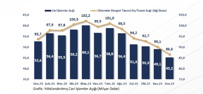 Bolat, 2023'ün mayıs ayında 60,1 milyar dolar olarak gerçekleşen yıllıklandırılmış cari işlemler açığının sonraki aylarda 14,9 milyar dolar azalarak aralık itibarıyla 45,2 milyar dolara gerilediğini, geçen yıl temmuz ayından itibaren yıllıklandırılmış dış ticaret açığının her ay düştüğünü, böylelikle yıllıklandırılmış cari işlemler açığının her ay azalarak olumlu trend kaydettiğini aktardı.