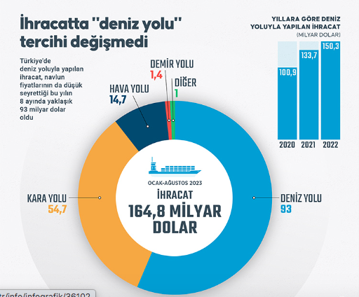 Bu yılın 8 ayında ihracat 164 milyar 793 milyon 509 bin dolar olarak gerçekleşti. Söz konusu dönemde taşıma şekillerine göre ihracata bakıldığında, ilk sırayı 92 milyar 970 milyon 27 bin dolarla deniz yolu aldı.