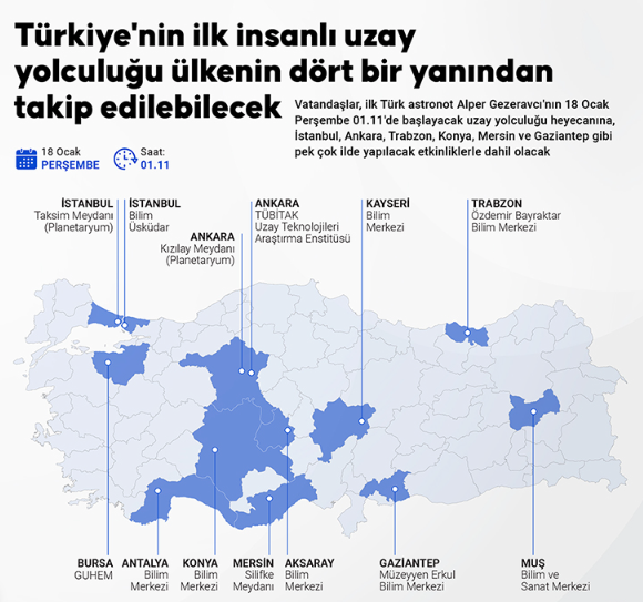 Vatandaşlar, ilk Türk astronot Alper Gezeravcı'nın gece yarısından sonra başlayacak uzay yolculuğu heyecanına, İstanbul, Ankara, Trabzon, Konya, Mersin ve Gaziantep gibi pek çok ilde yapılacak etkinliklerle dahil olacak.