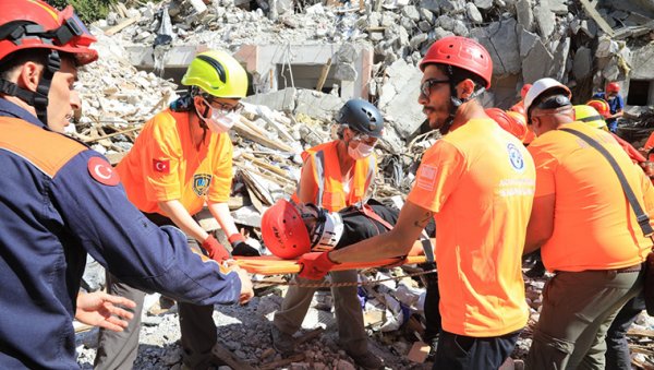 Enkazdan afetzedeyi çıkaran ekipler, sevkini yaparak tatbikatı tamamladı.