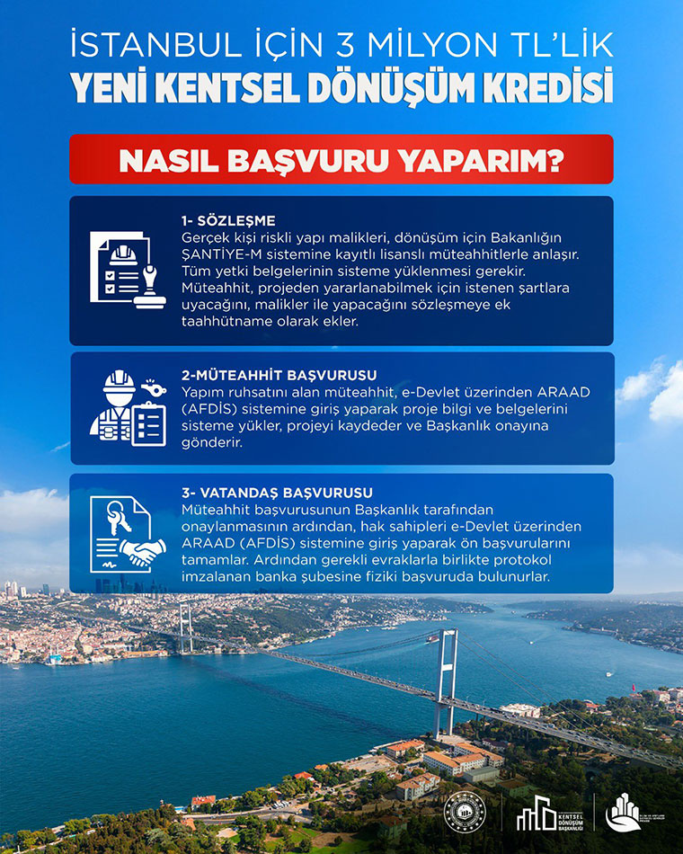 Çevre, Şehircilik ve İklim Değişikliği Bakanı Murat Kurum, sosyal medya hesabından yaptığı paylaşımda İstanbul’da riskli binaların dönüşümü için sağlanan yenik kentsel dönüşüm projesinin detaylarına ilişkin paylaşım yaptı. Bakan Kurum mesajında “İstanbul için sunduğumuz 3 milyon TL’lik yeni kentsel dönüşüm kredisinde; Nasıl başvuru yapılır? Kredi koşulları neler? Dev destek paketimize dair merak edilenler” ifadelerine yer verdi.
