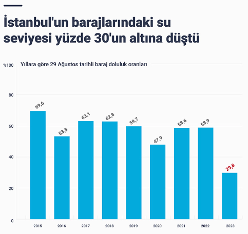 İSKİ istatistiklerine göre, 29 Ağustos tarihli baraj doluluk oranları 2015'te yüzde 69,56, 2016'da yüzde 53,33, 2017'de yüzde 63,07, 2018'de yüzde 62,84, 2019'da yüzde 59,74, 2020'de yüzde 47,94, 2021'de yüzde 58,57, 2022'de yüzde 58,9 iken bugünkü oran yüzde 29,78 ölçüldü.
