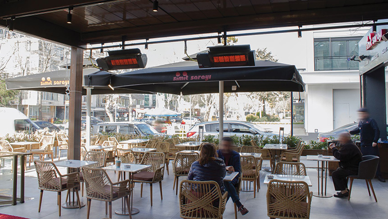 Açık alanlarda ki değerlendirme kriterlerimiz ise mekânın yapısı yani yüksekliği, masa yerleşim planı, mahalin rüzgâr durumu, mekânın üstünde açılıp kapanan tente ya da sabit bir tavan olması veya olmaması gibi detaylar oluyor. Açık alanlarda genellikle borulu radyant sistemler, seramik plakalı radyant sistemler veya yüksek yoğunluklu elektrikli infrared ürünler ile ısıtma yapıyoruz.
