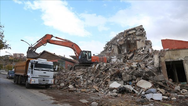 Güneşli Mahallesi'ndeki ağır hasarlı bina, iş makineleriyle yıkıldı.