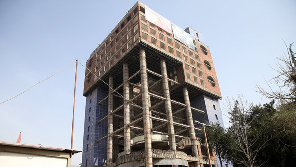 Arama motoru Google'da "Dünyanın en saçma binası" olarak ilk sırada çıkan ve kaplama söküm işlemleri tamamlanan Kahramanmaraş'taki 18 katlı yapının yıkım çalışmaları devam ediyor.