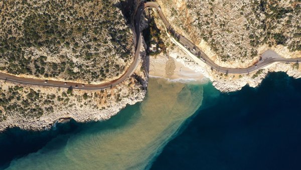 Antalya'nın Kaş ilçesindeki turkuaz rengiyle ünlü plajda yağışın ardından oluşan manzara, dron ile görüntülendi.