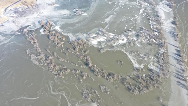 Dondurucu soğukların etkisiyle Kars Barajı'nın yüzeyi kısmen buzla kaplandı.