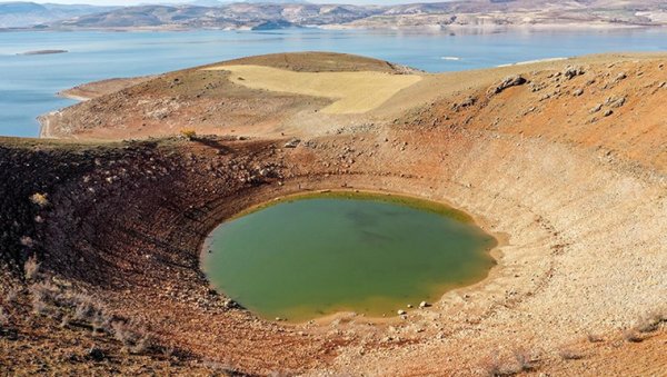 Bunun üzerine teknesini kıyıya demirleyerek suların çekildiği alana giden Gündüz, kıyıdan yaklaşık 150 metre içerideki bir tepenin arka kısmında içerisinde su bulunan dev bir çukur olduğunu gördü.