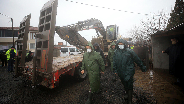 Atatürk Mahallesi'nde Edirne Valisi Ekrem Canalp tarafından karşılanan Çataklı, burada Kırkkavak Deresi'nin taşması sonucu sel sularından etkilenen yerler hakkında Vali Canalp'tan bilgi aldı.