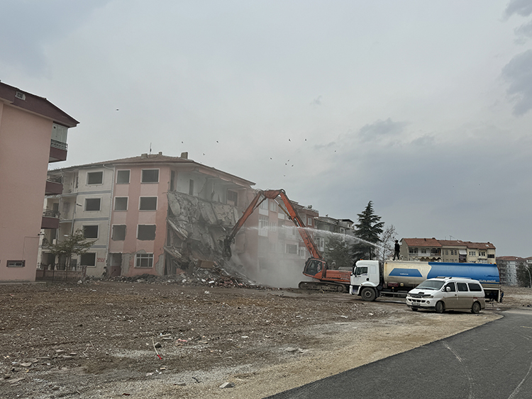 İş makinesiyle yıkım yapan ekipler, bir taraftan da tankerden enkaza su sıkarak toz oluşmasını engellemeye çalıştı.